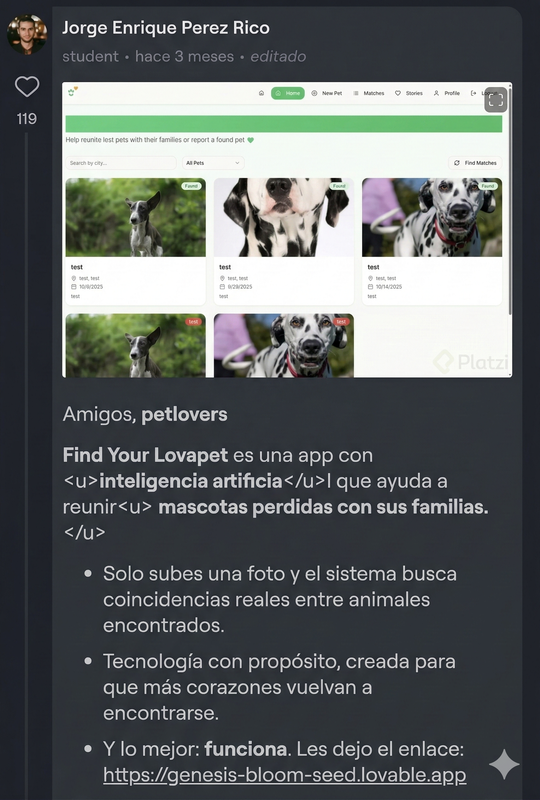 Para dar like a un proyecto, solo vas al sistema de comentarios y haces clic en el corazoncito.