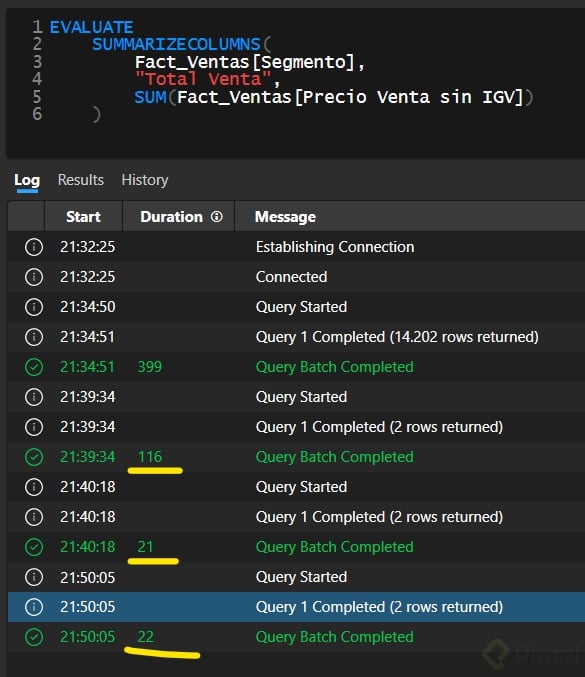 Al evaluar esta expresión, observa el Log para ver la eficiencia de su ejecución, comparando el tiempo requerido contra evaluaciones directamente sobre tablas completas.