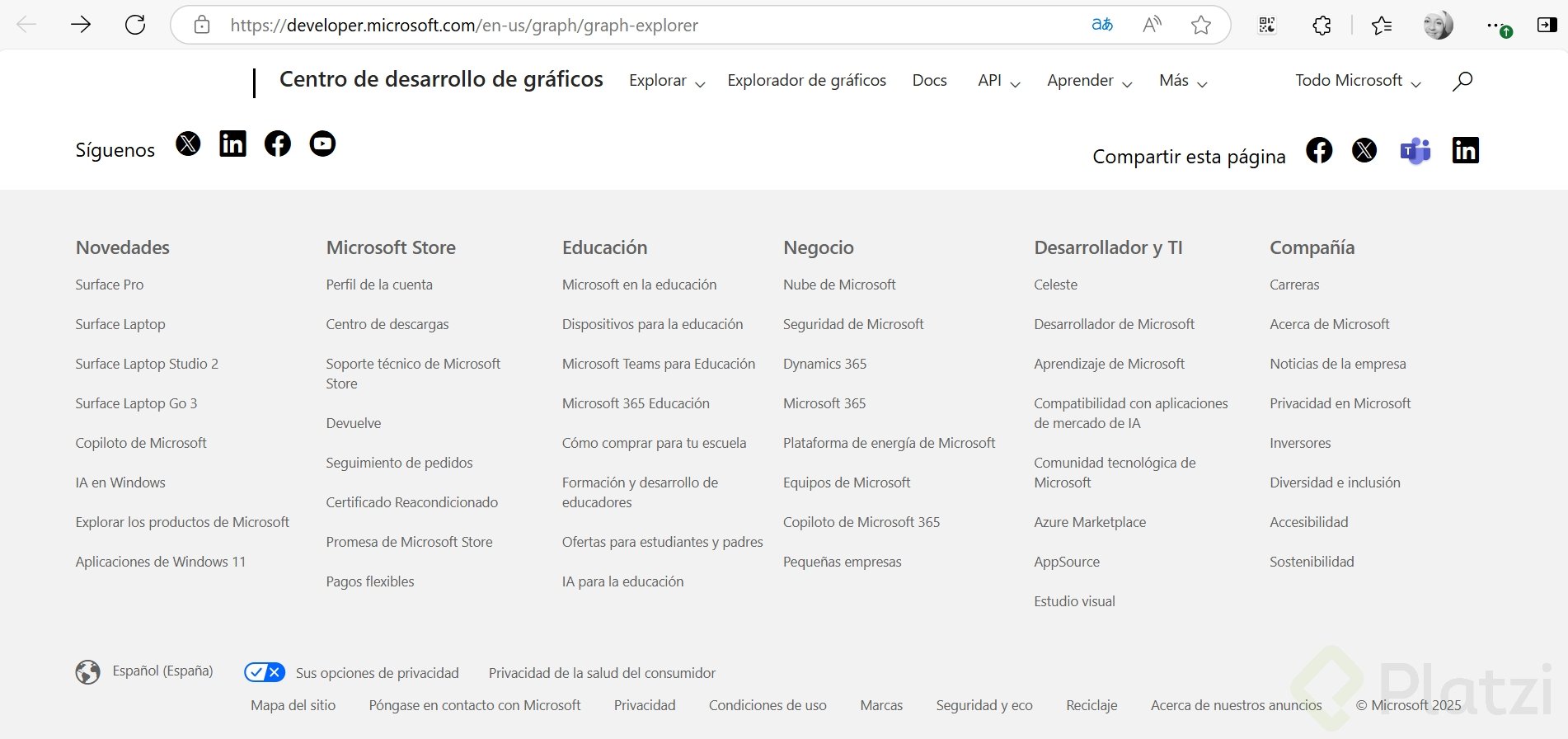 Para conocer mejor este elemento de seguridad, es posible utilizar la herramienta llamada Graph Explorer. Al ingresar con las credenciales empresariales, esta herramienta permite explorar diversa información disponible: