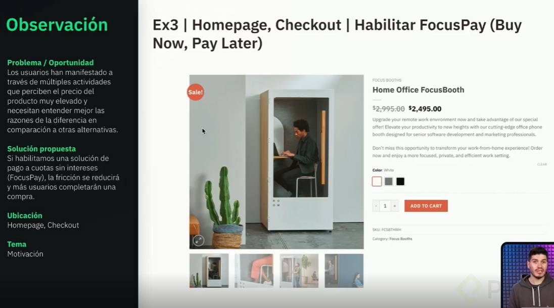 Analizar tus páginas de observación y recolectar información de usuarios es fundamental. Por ejemplo, si se detecta que el precio de un producto es una barrera para la compra debido a la falta de flujo de caja, la solución podría ser: