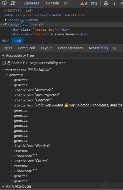 - Inspeccionar elementos: Al inspeccionar la página, busca la sección donde el navegador realiza el "Aria tree" o árbol de accesibilidad.