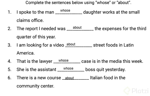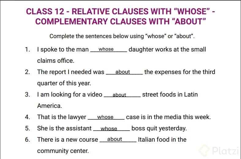 - Ejercicios Escritos: Completa frases utilizando cuyo o sobre para reforzar la estructura y significado.
