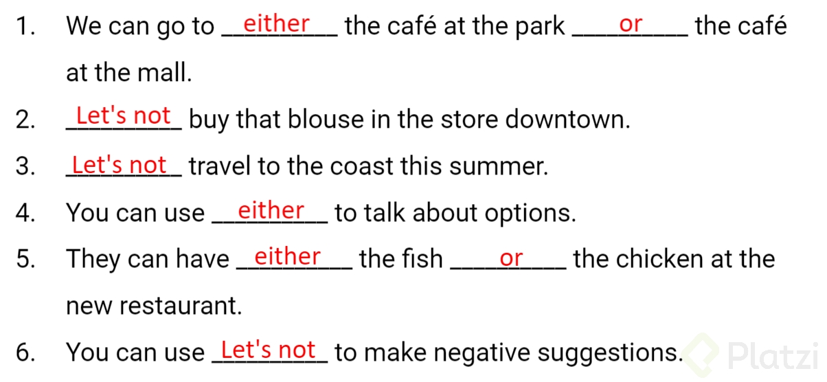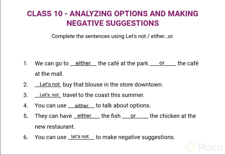 La práctica es clave para dominar el uso de estas herramientas lingüísticas. Un ejemplo sería completar oraciones como: Let's not go out in the morning o You may either buy in the market or at the store. Recuerda que después de let's not, el verbo debe estar en su forma base, y al usar either...or, se presentan claramente dos opciones.