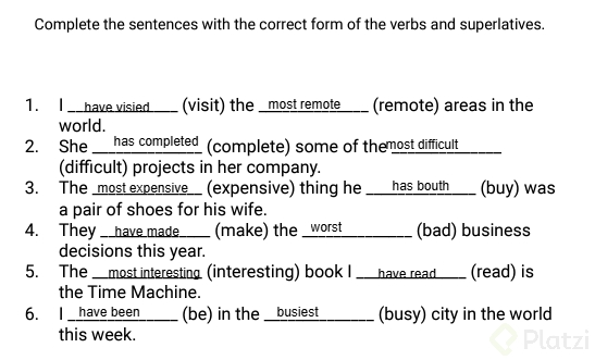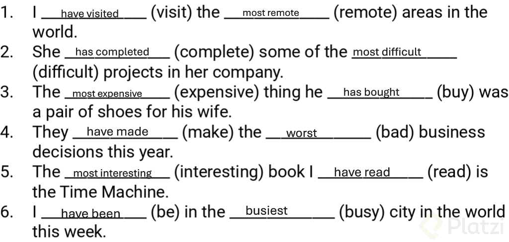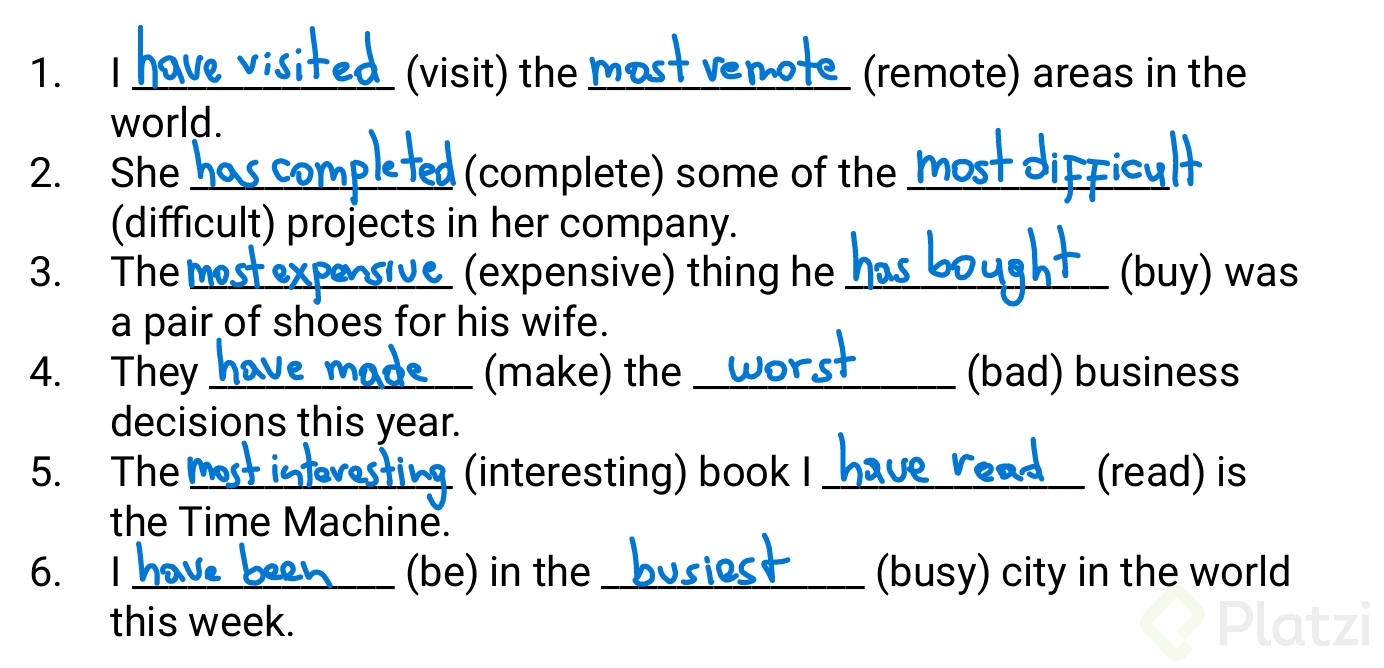 Para consolidar tu comprensión, es útil practicar con ejercicios que incluyan completar frases utilizando superlativos y el presente perfecto. Algunos ejemplos pueden ser:
