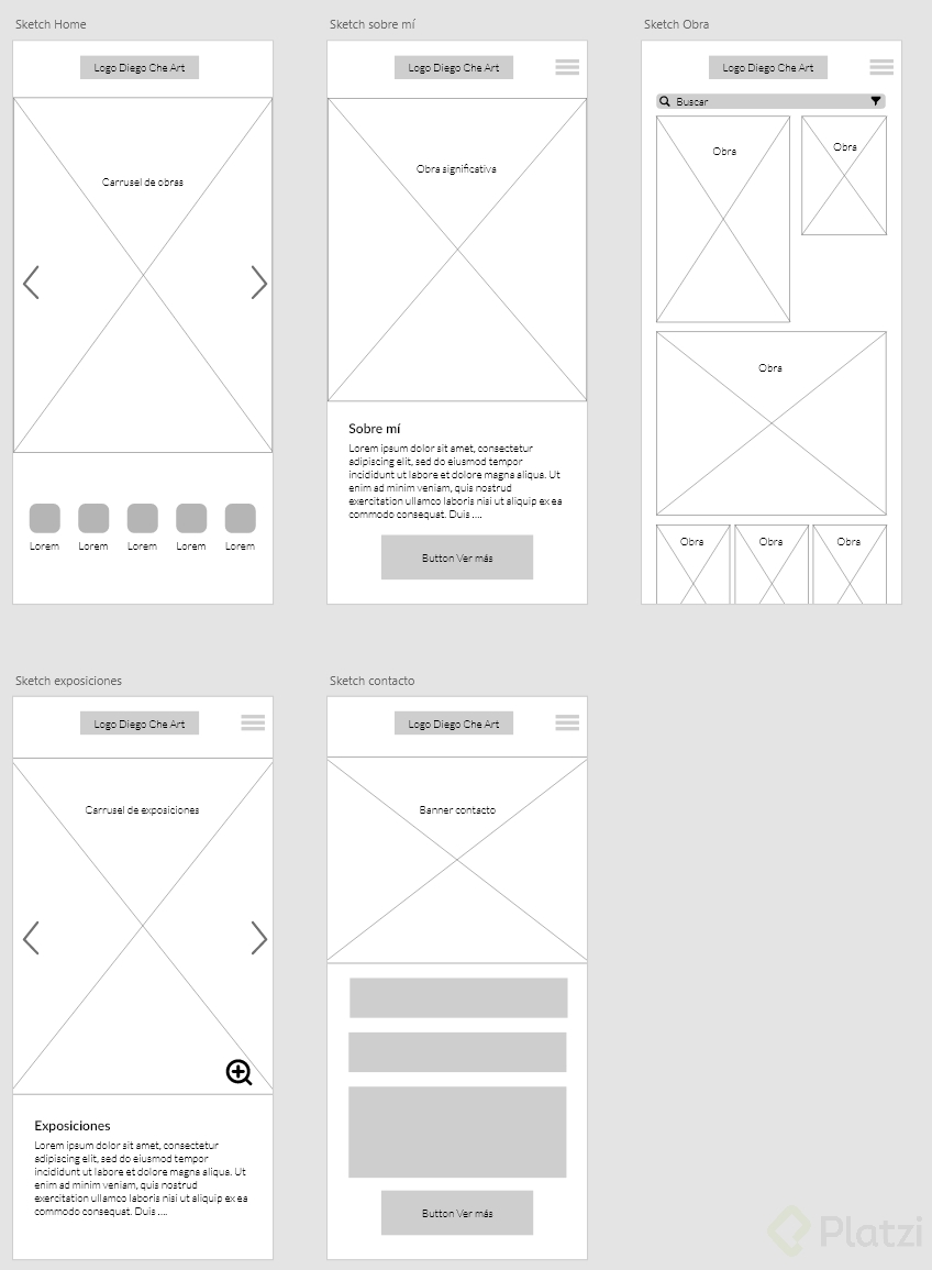 Sketch inicial: Dibuja a mano cada pantalla, incluyendo los elementos esenciales que genere una transición coherente entre ellas.