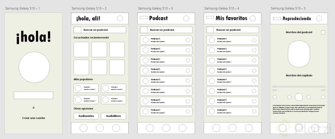 - Aplicación del diseño: Al trabajar desde el mood board, los wireframes de baja fidelidad evolucionan hacia maquetas detalladas que reflejan el estilo diseñado. Esto incluye la adición de colores, tipografías y formas específicas que definen la estética de la aplicación.