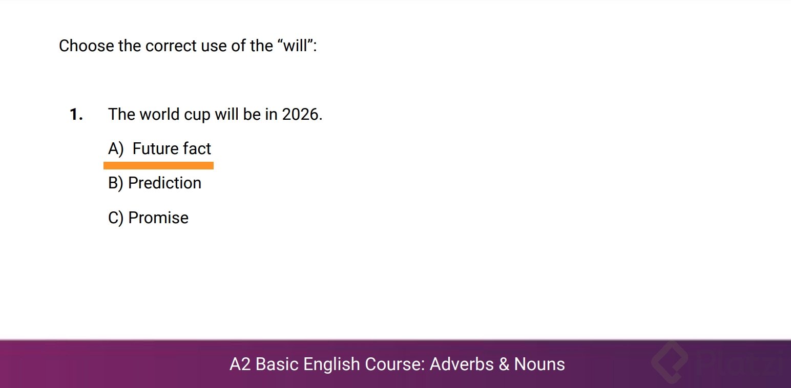 A veces, se usa will para hablar de hechos que sucederán en el futuro con certeza. Por ejemplo, si estás en un viaje de negocios y sabes que no estarás en casa toda la semana, puedes decir: "No estaremos en casa en toda la semana". Esto subraya un conocimiento seguro sobre el futuro.