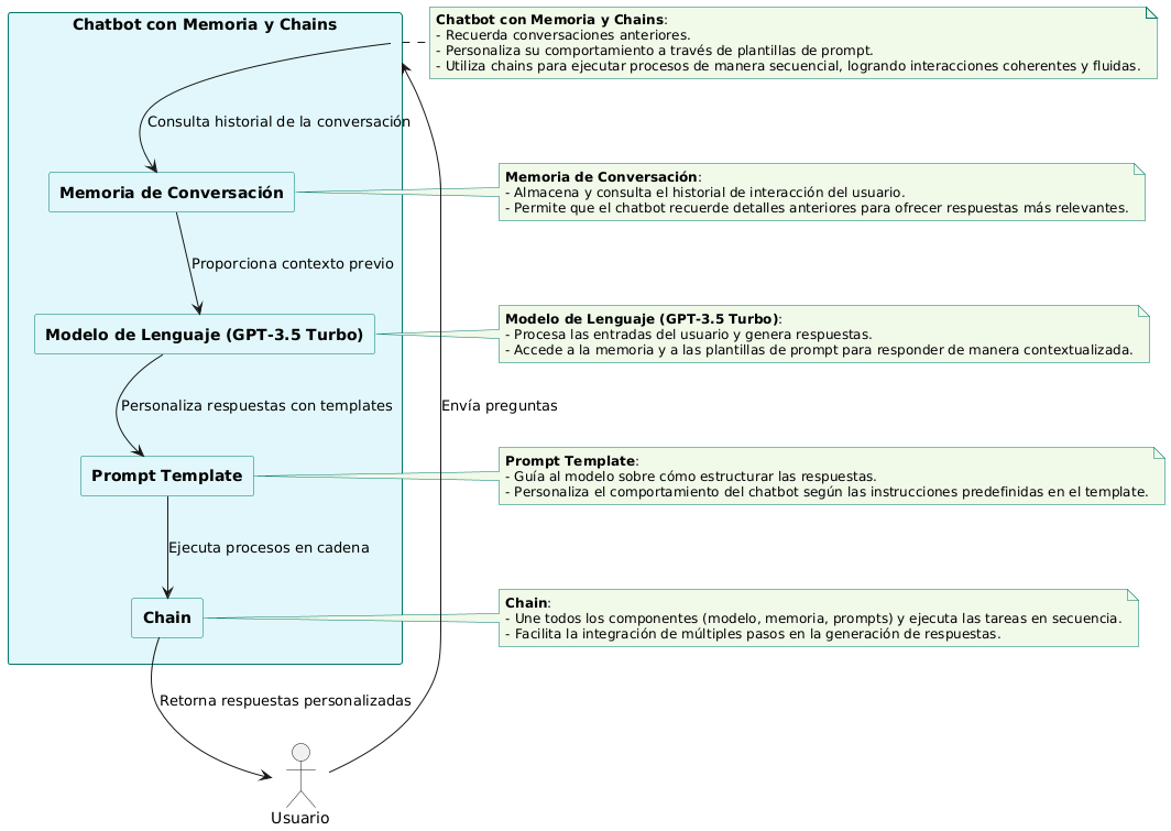 Un chatbot inteligente con estos componentes puede personalizar la experiencia del usuario, recordando detalles importantes y manteniendo el contexto. Los prompt templates proporcionan la base para el comportamiento del chatbot, mientras que la memoria garantiza que las interacciones sean continuas y fluidas. Al integrar estos elementos en un chain, optimizamos la arquitectura del chatbot, haciéndolo más eficiente y escalable.