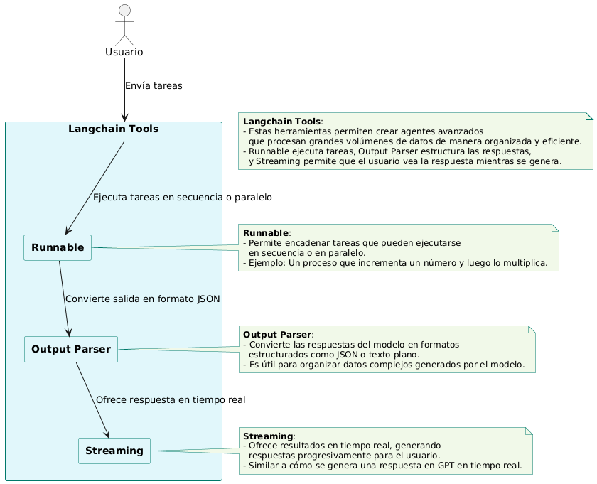 La combinación de estas herramientas permite construir agentes que no solo ejecuten tareas de manera eficiente, sino que también entreguen respuestas precisas y en tiempo real. Un agente que utiliza Runnable puede manejar múltiples tareas de manera simultánea o secuencial, y con OutputParser puedes asegurarte de que las respuestas del modelo tengan el formato adecuado. Streaming, por su parte, mejora la experiencia del usuario al ofrecer resultados inmediatos.