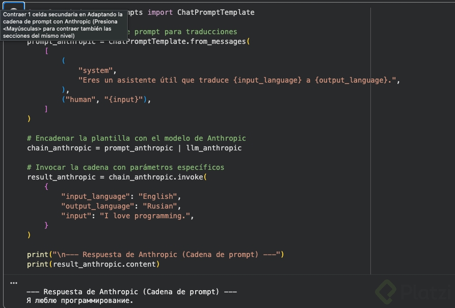 Podemos mejorar la funcionalidad del modelo encadenándolo con plantillas de prompts. Esto permite adaptar el comportamiento del modelo de forma dinámica, por ejemplo, para traducciones entre diferentes idiomas.