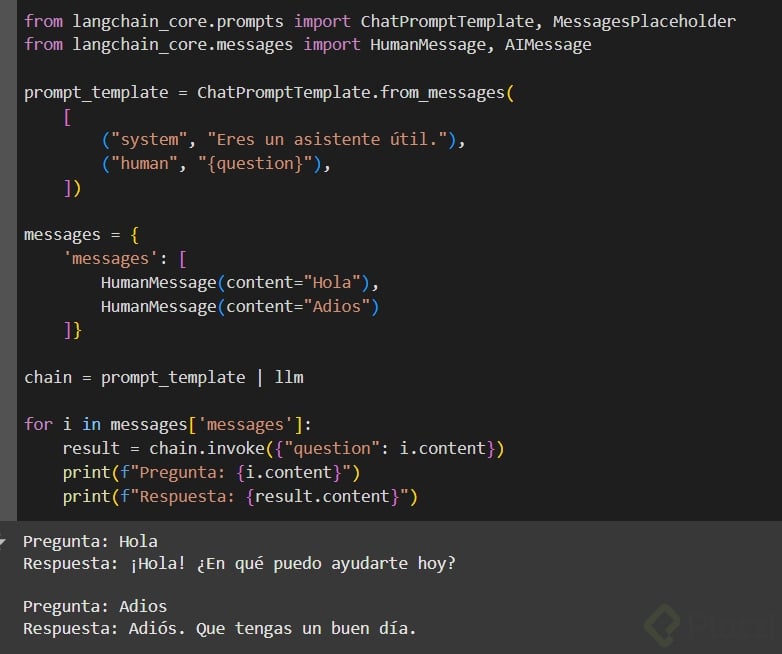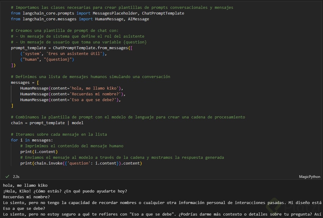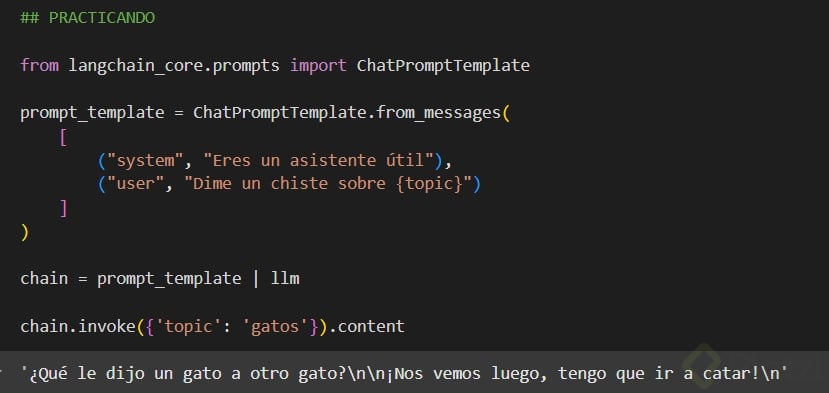 - Crear una conversación básica: Utilizando el ChatPromptTemplate para darle un papel a cada parte, ya sea System o User.