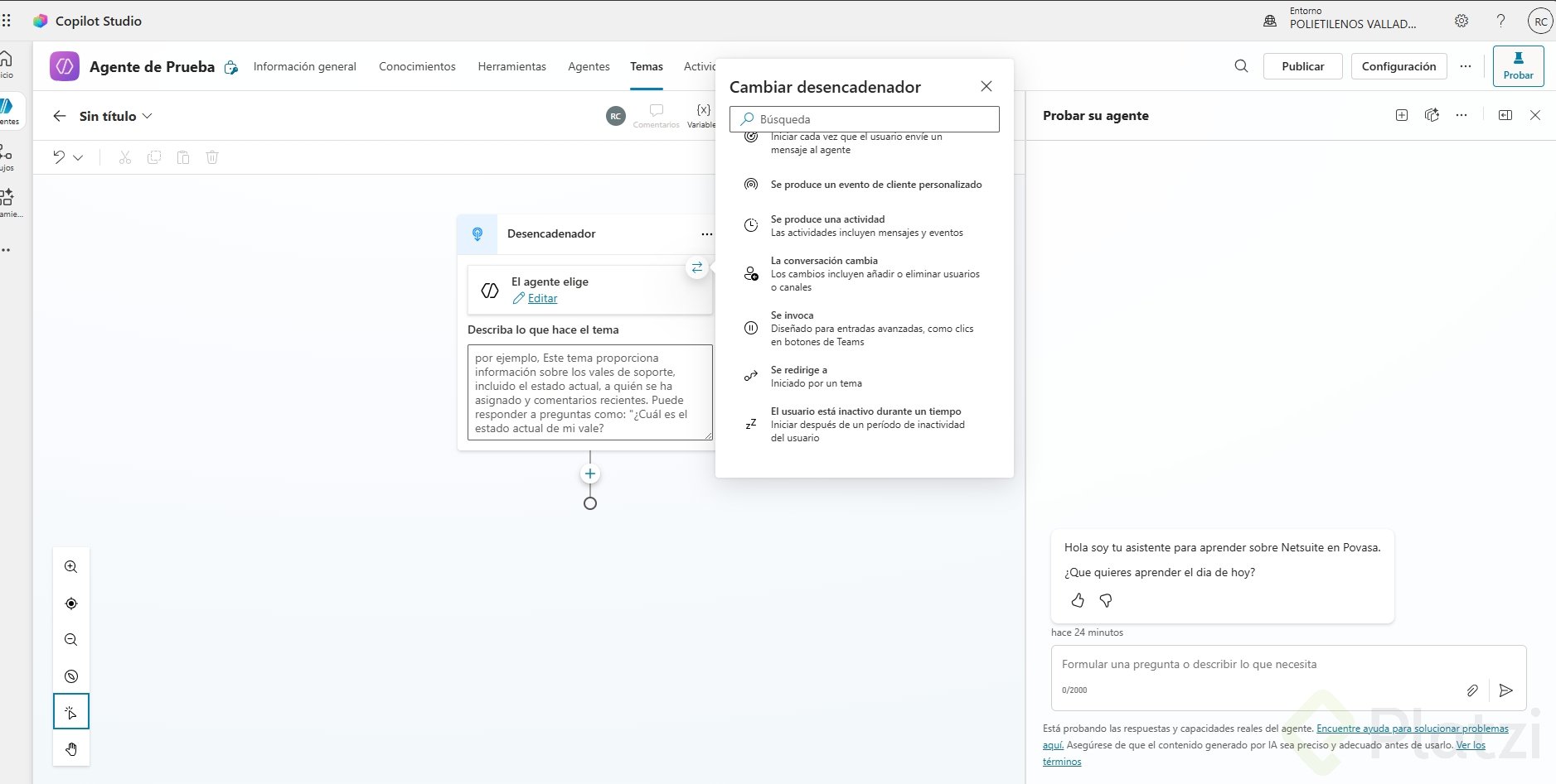 Un tema es una conversación específica con su propio flujo y respuestas. Un desencadenador es la señal que activa ese tema. Juntos definen qué atiende el agente y cuándo debe hacerlo.