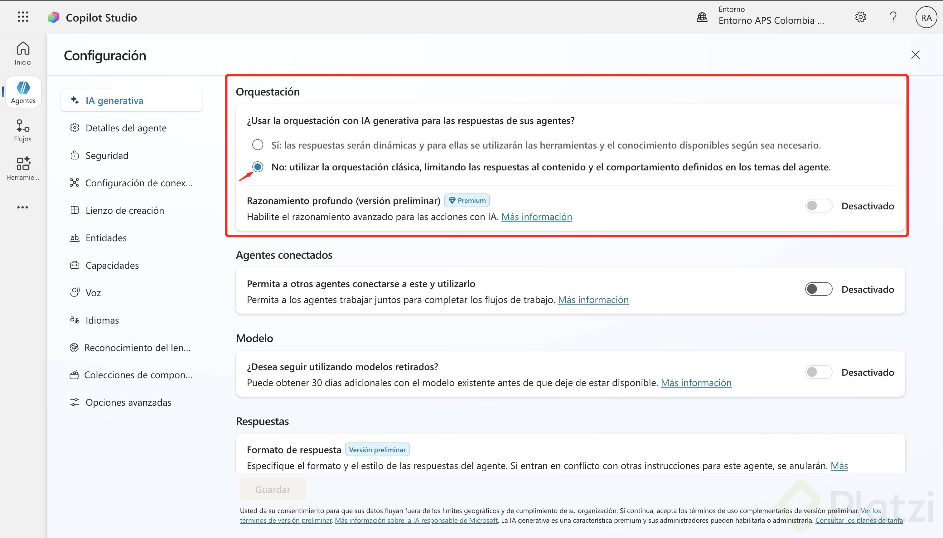 - Prueba el flujo y recarga el agente: ante “Quiero saber sobre la presentación de la clase tres”, el agente puede pedir claridad entre “búsqueda de clases”, “recursos” o “ninguno de los anteriores”. Elige “recursos” para seguir el caso.