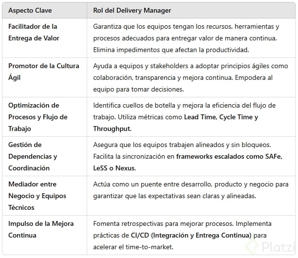 El Delivery Manager también actúa como un Project Manager, siendo responsable de la ejecución de los proyectos y programas. Las tareas clave incluyen: