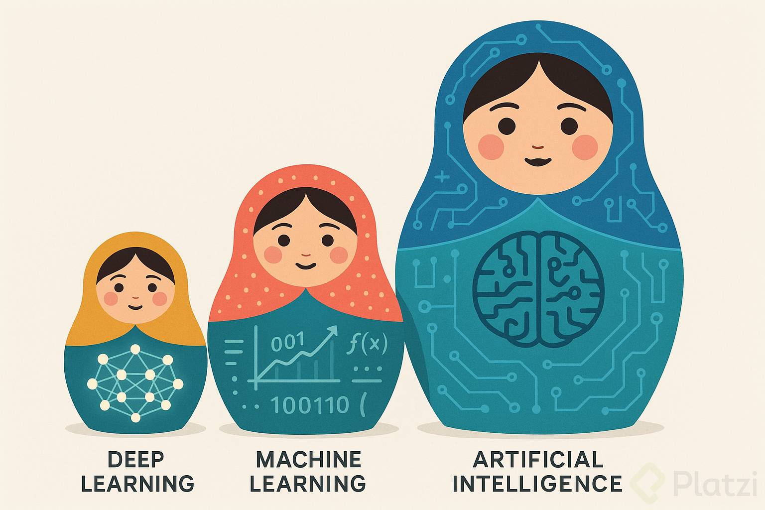 [0:19] Relación jerárquica: IA como concepto más amplio que contiene machine learning, que a su vez contiene deep learning (analogía de muñecas rusas)