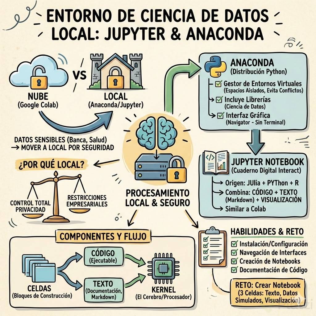 El objetivo principal de esta clase era enseñar a los estudiantes a configurar un entorno de trabajo local para ciencia de datos, específicamente introduciendo Jupyter Notebook y Anaconda como herramientas fundamentales. El profesor buscaba que los estudiantes comprendieran cuándo y por qué es necesario trabajar localmente en lugar de usar herramientas en la nube como Google Colab, especialmente en contextos profesionales con datos sensibles.