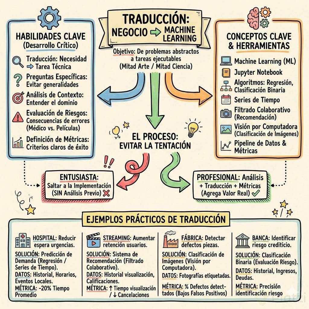 - Traducción de problemas: Convertir necesidades de negocio en tareas técnicas de ML