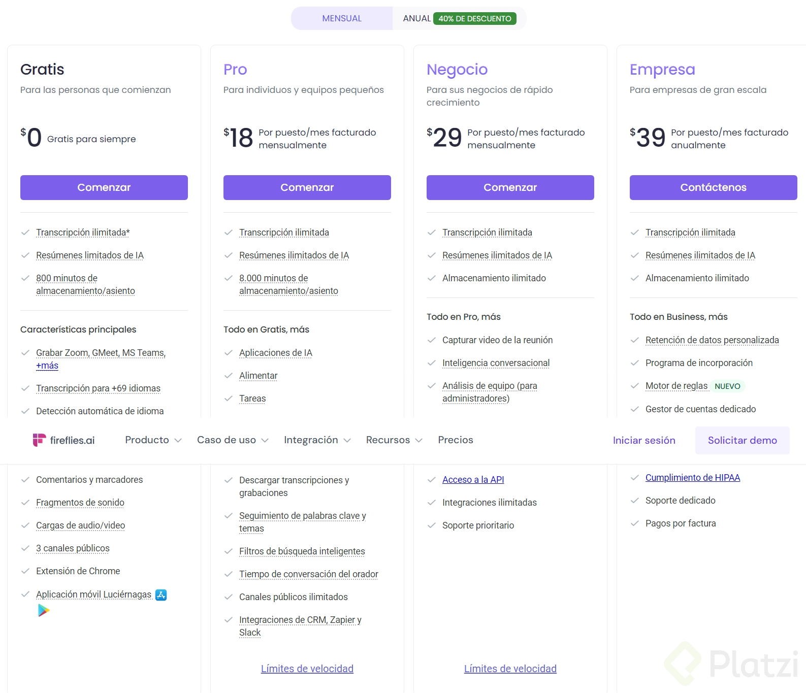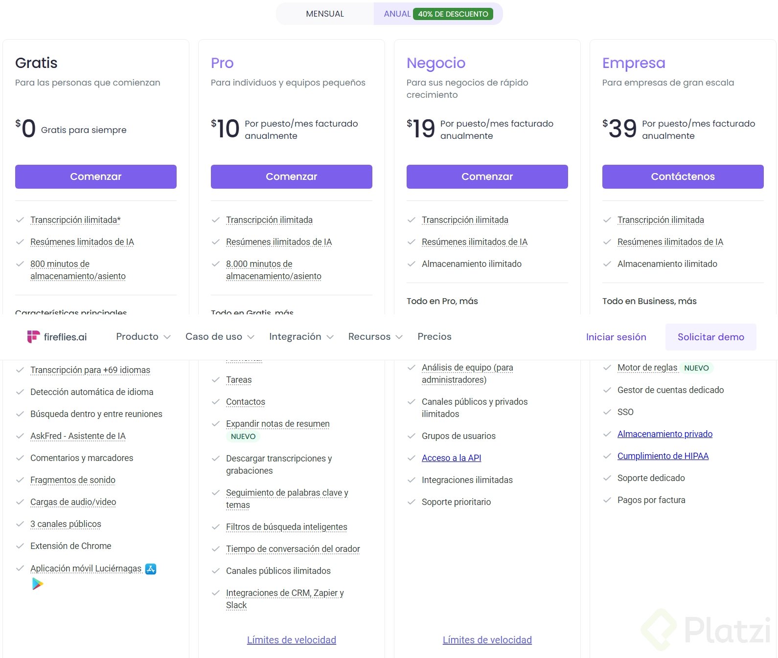 Algunas herramientas, como Fireflys, pueden ofrecer servicios adicionales, como resúmenes, notas, e ítems accionables de tu reunión.