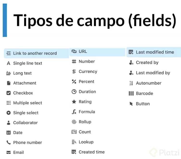 ¿Cuáles son los tipos de campos que ofrece Airtable?