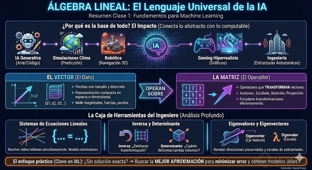 El álgebra lineal conecta problemas complejos con soluciones concretas. Sus vectores, matrices y transformaciones lineales permiten pasar de lo abstracto a lo computable, ya sea al rotar un objeto en 3D o al resolver miles de ecuaciones a la vez.