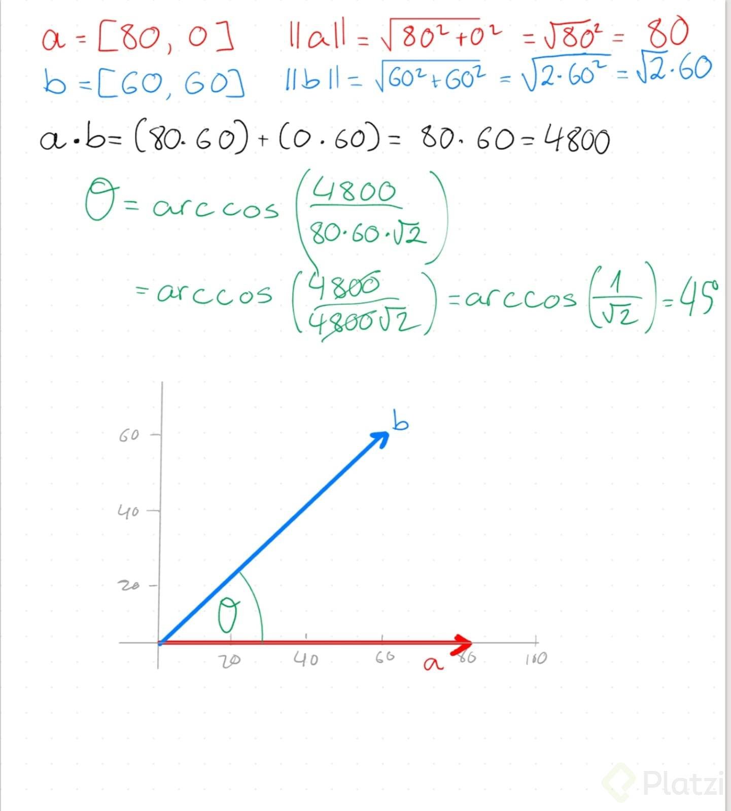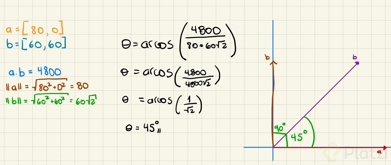 Con esta base, puedes pasar de longitudes y producto punto al ángulo entre vectores.