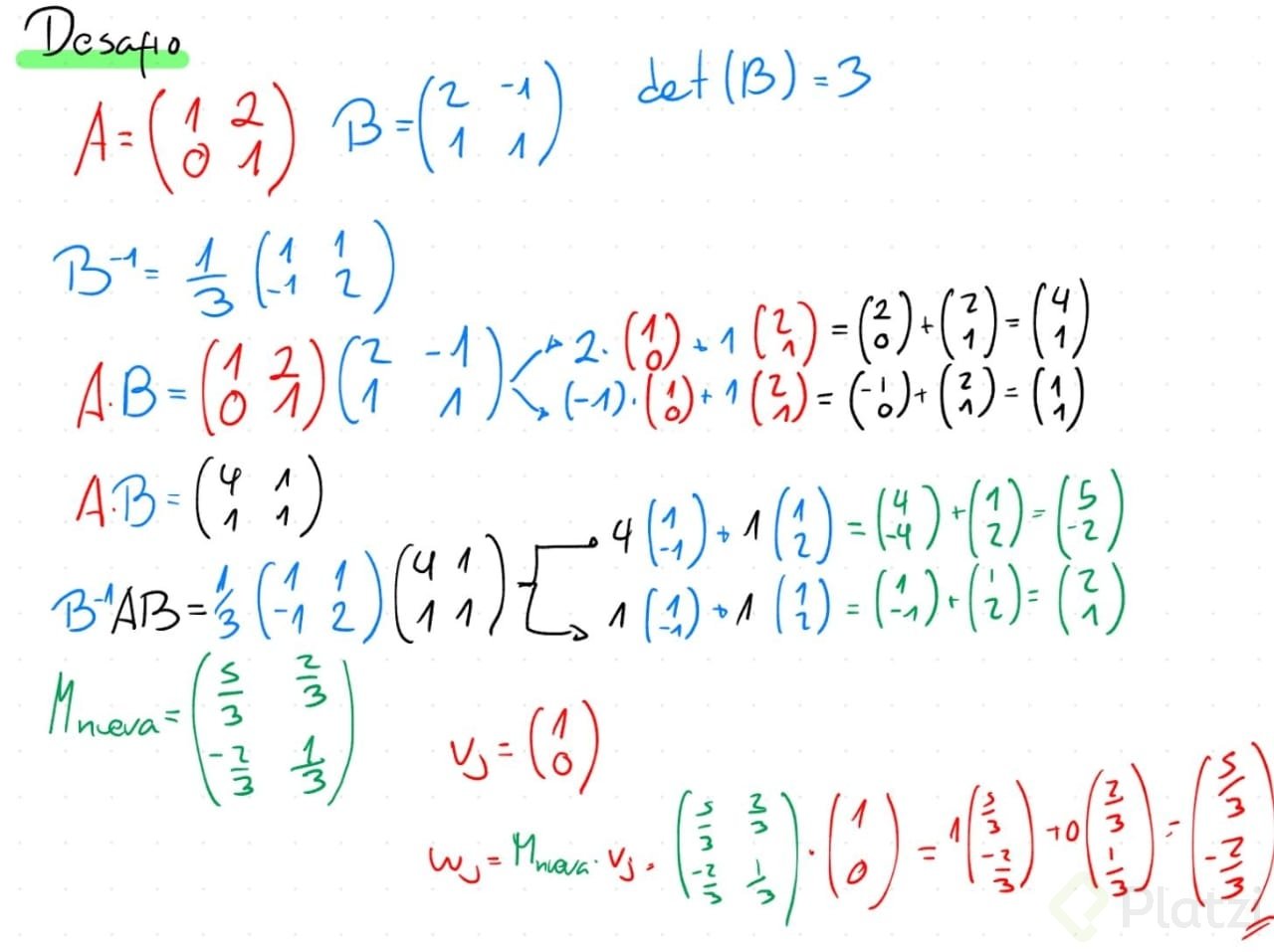 - Conceptos clave: matriz de cambio de base, determinante, matriz inversa, producto de matrices, traducción de coordenadas, rotación de 90 grados.