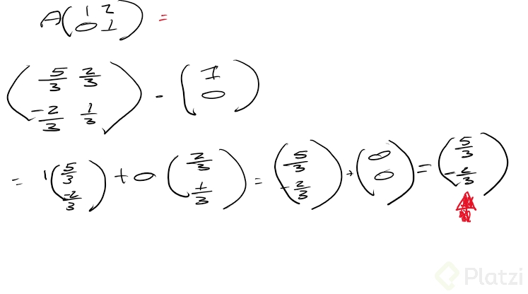 - Paso 1: calcular la matriz inversa de B. Determinante de B: 2·1 − (−1·1) = 3. Entonces, B⁻¹ = (1/3) · [1 −1; 1 2].