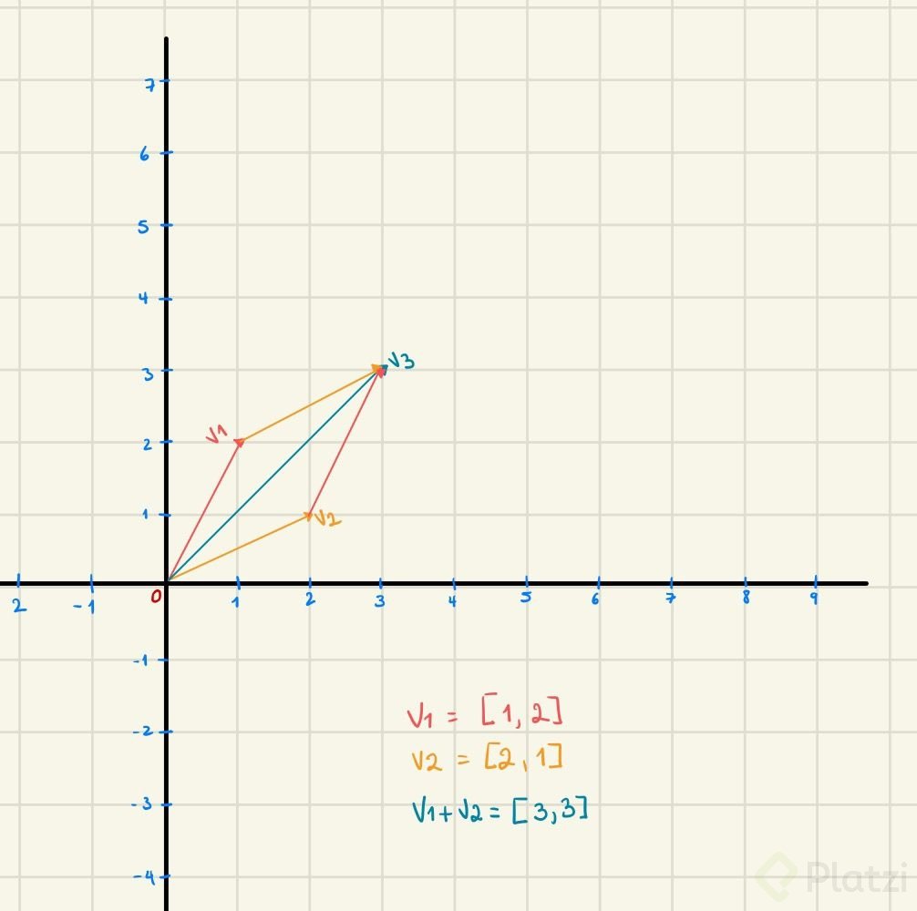 Ejemplo explícito: V1 = (1, 2) y V2 = (2, 1). Fija B = 1 y toma A = 2. Primero escala V1 al doble y luego suma V2.