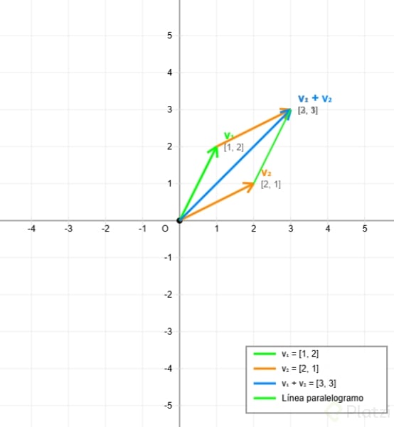 - Aplica la regla del paralelogramo para sumar: desplaza un vector a la punta del otro y traza la diagonal desde el origen.