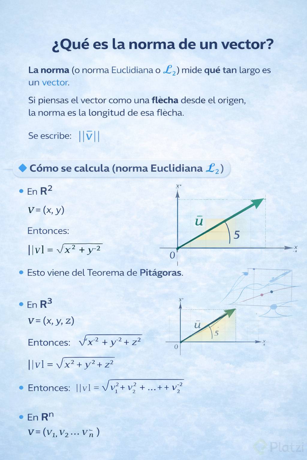 Aprende a medir la longitud de un vector con precisión. Aquí verás la norma L2 (euclidiana), sus propiedades, cómo normalizar para obtener un vector unitario, y un vistazo a otras normas útiles como L1, L0 y L∞. Todo con ejemplos simples y resultados exactos.