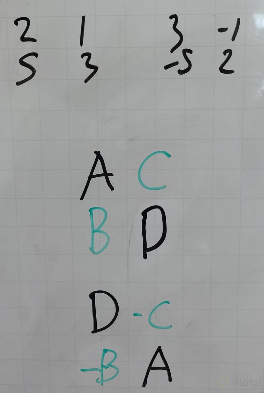 - Dados: A = [[2, 5], [1, 3]] y B = [[3, −5], [−1, 2]].