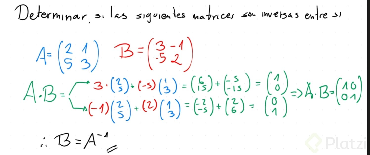 - Tarea: verifica si B es la inversa de A o si A es la inversa de B, multiplicando y buscando la matriz identidad.
