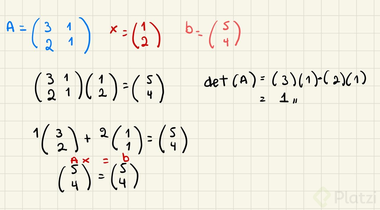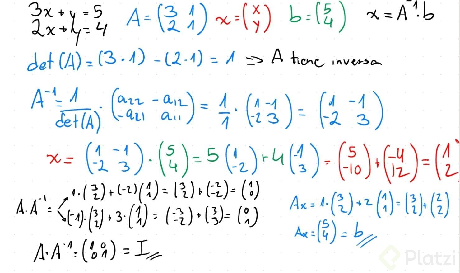 - Ejemplo: 3x + y = 5 y 2x + y = 4. El determinante es 1, por lo que existe inversa y el sistema tiene solución única: x = 1, y = 2. Verifica multiplicando A por el vector solución para recuperar B.