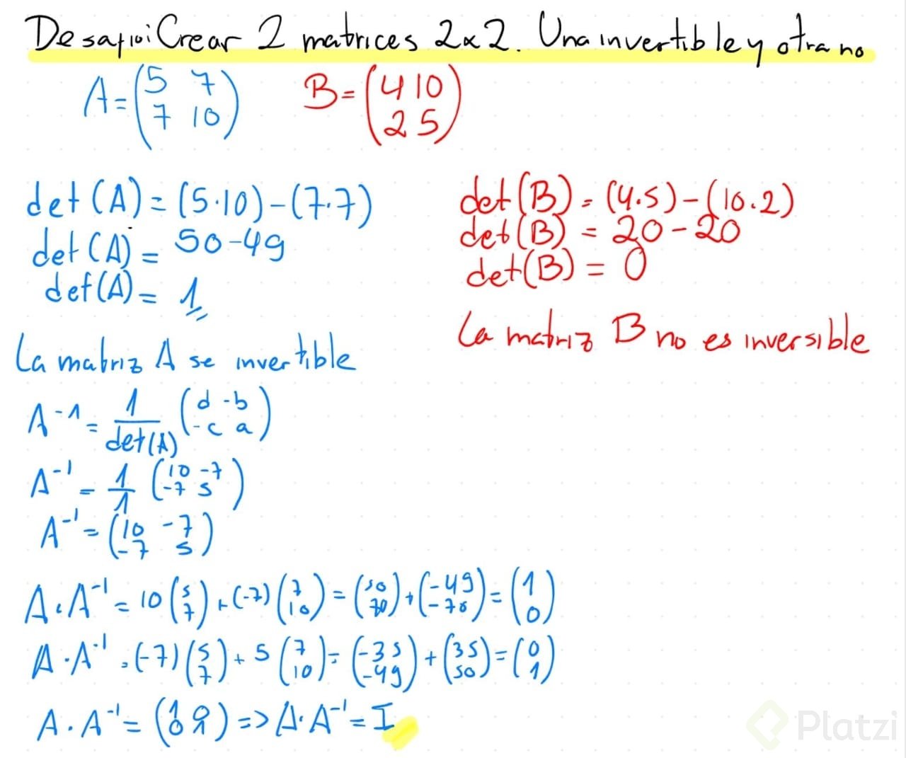 Habilidad que fortaleces aquí: interpretar el determinante como prueba de reversibilidad, aplicar la fórmula de la inversa 2×2, reconocer cuándo un sistema AX = B tiene solución única y validar resultados con la identidad y el producto punto. ¿Te animas a repetir los cálculos y compartir tus resultados o dudas en los comentarios?