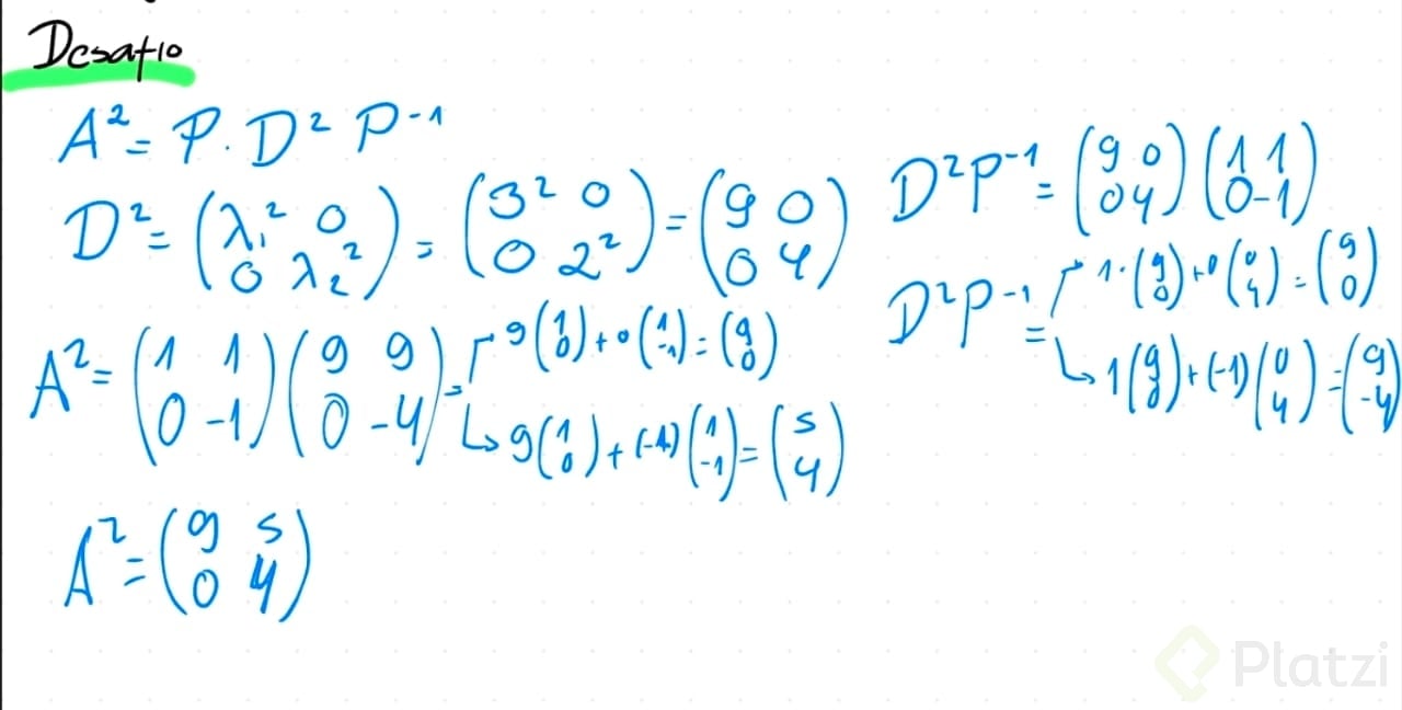 Te queda el ejercicio sugerido: usa A = [[3, 0], [1, 2]] y calcula A² con D² = diag(3², 2²), luego multiplica por P y P inversa.