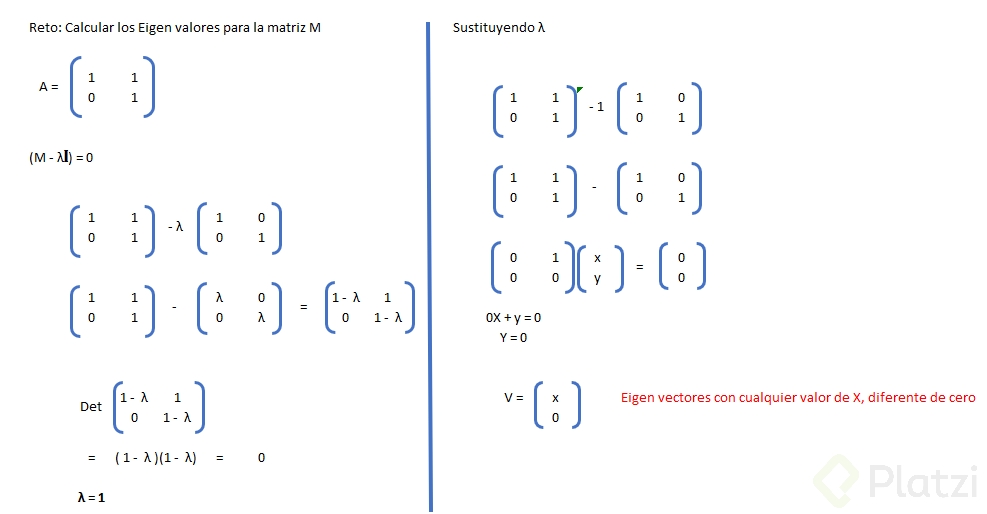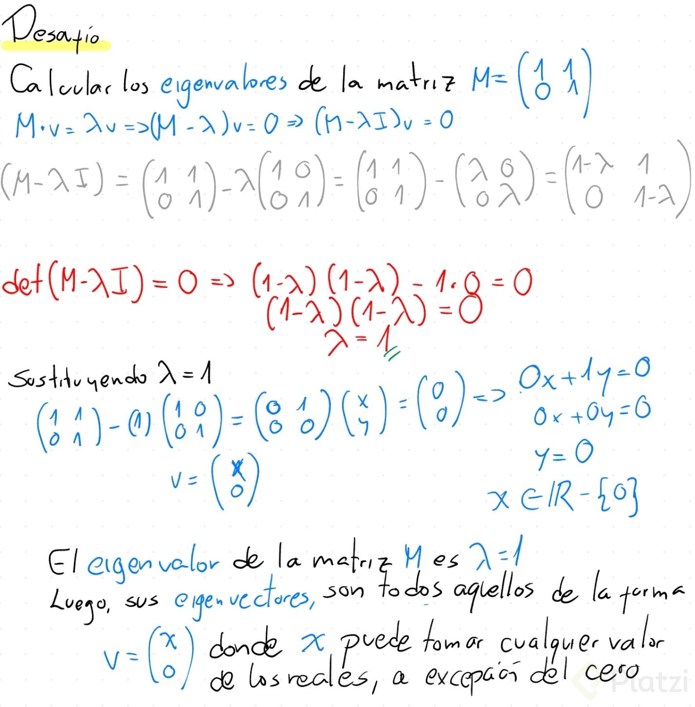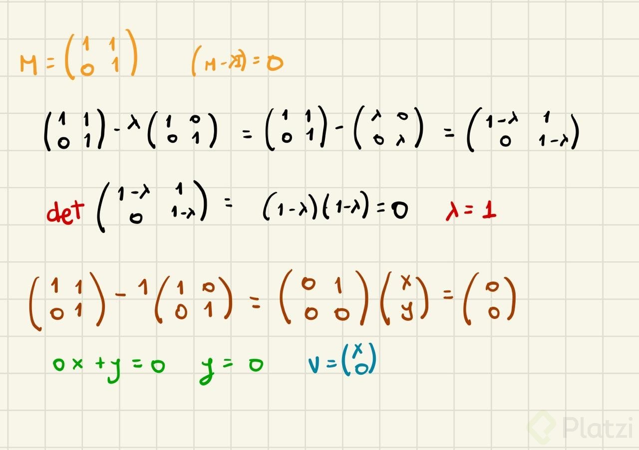 Para practicar, resuelve la matriz de inclinación hacia la derecha M = [1 0; 1 1]: calcula sus eigenvalores y eigenvectores usando det(M − λI) = 0 y comparte tus resultados en los comentarios.