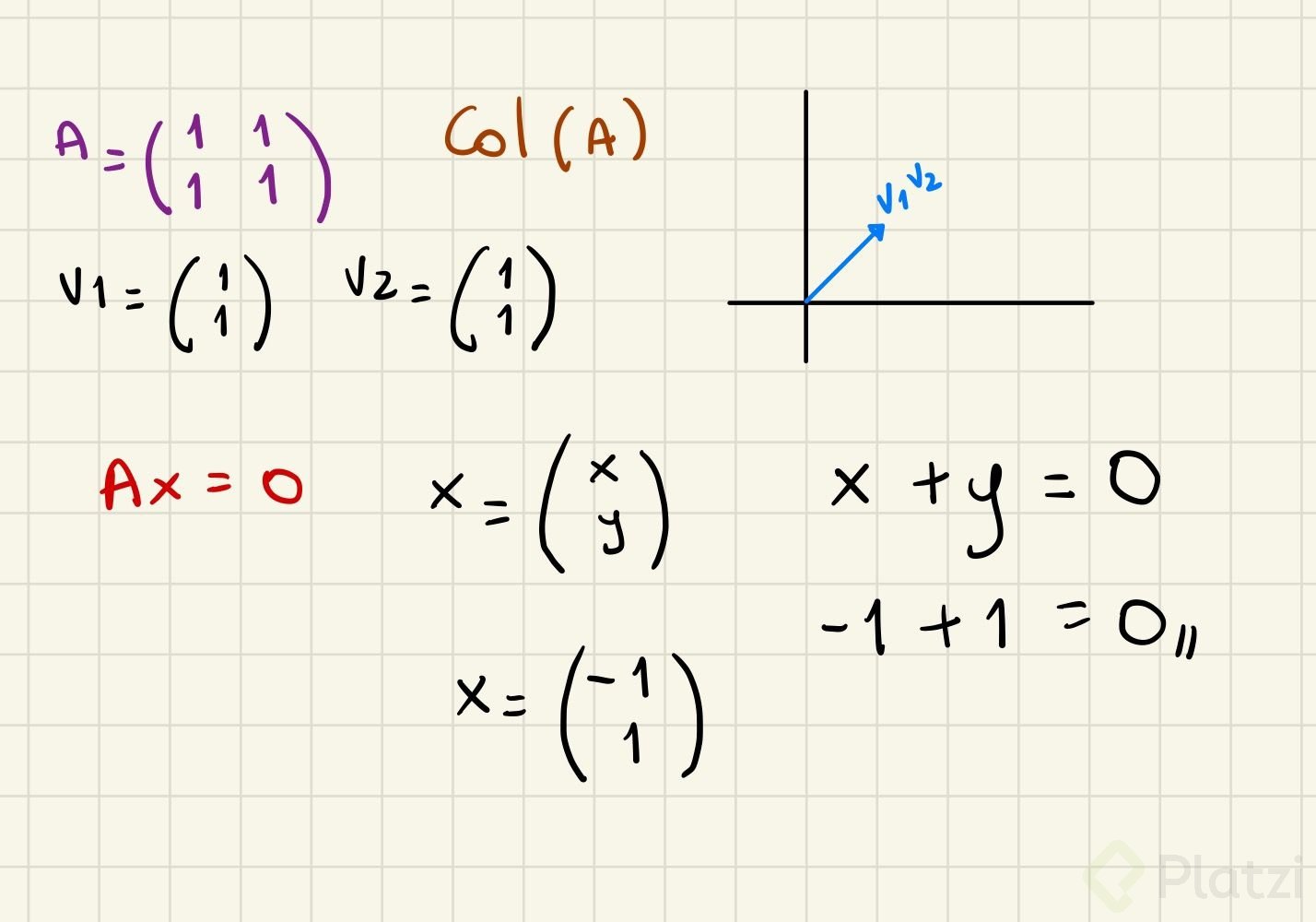 - Son paralelas: v2=2·v1. El espacio columna es una sola línea por el origen.