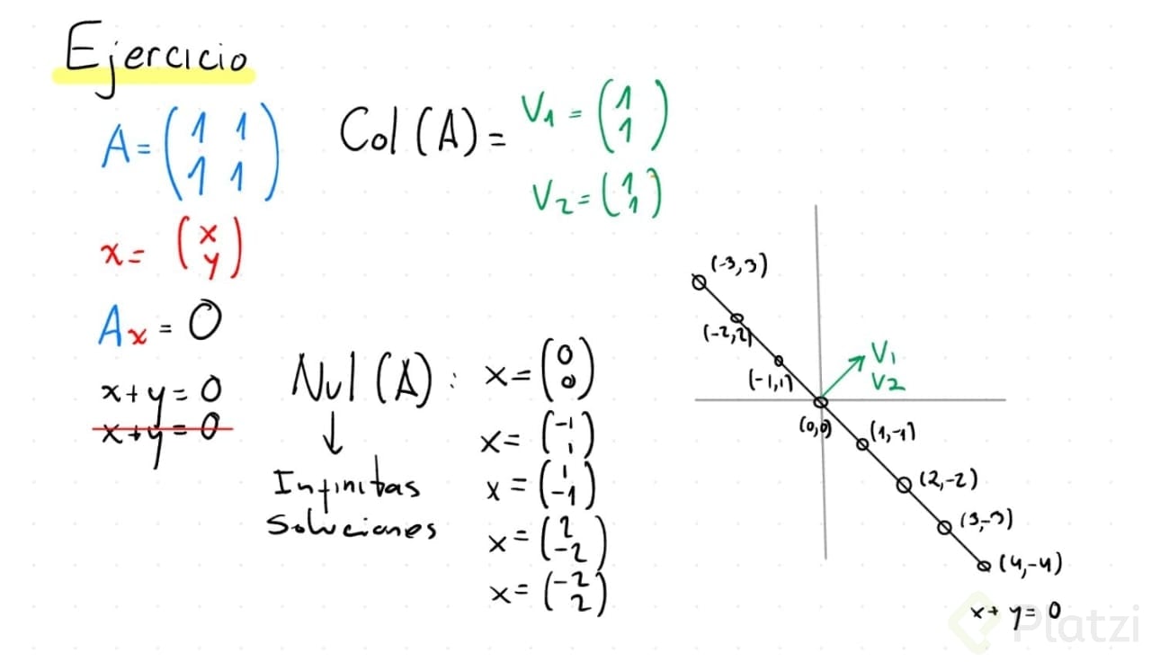 El espacio nulo (null A) es el conjunto de todos los x tales que Ax=0. Geométricamente, son los vectores que la transformación A “aplasta” al origen. Este subespacio responde si la solución de Ax=b es única o infinita: