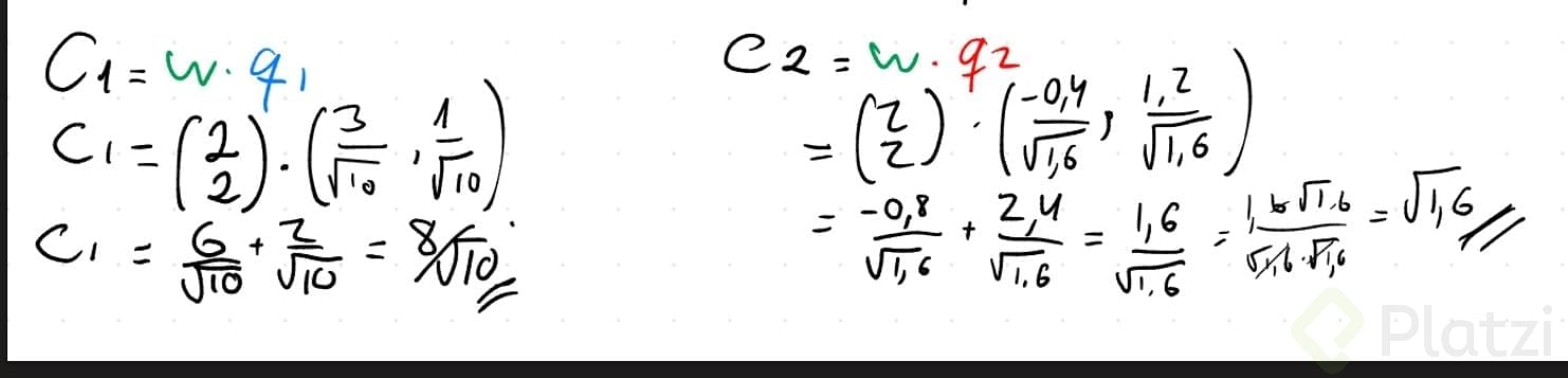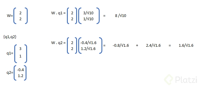 - Normalización: Q1 = u1/||u1|| = (3/√10, 1/√10). Q2 = u2/||u2|| = (−0.4/√1.6, 1.2/√1.6).
