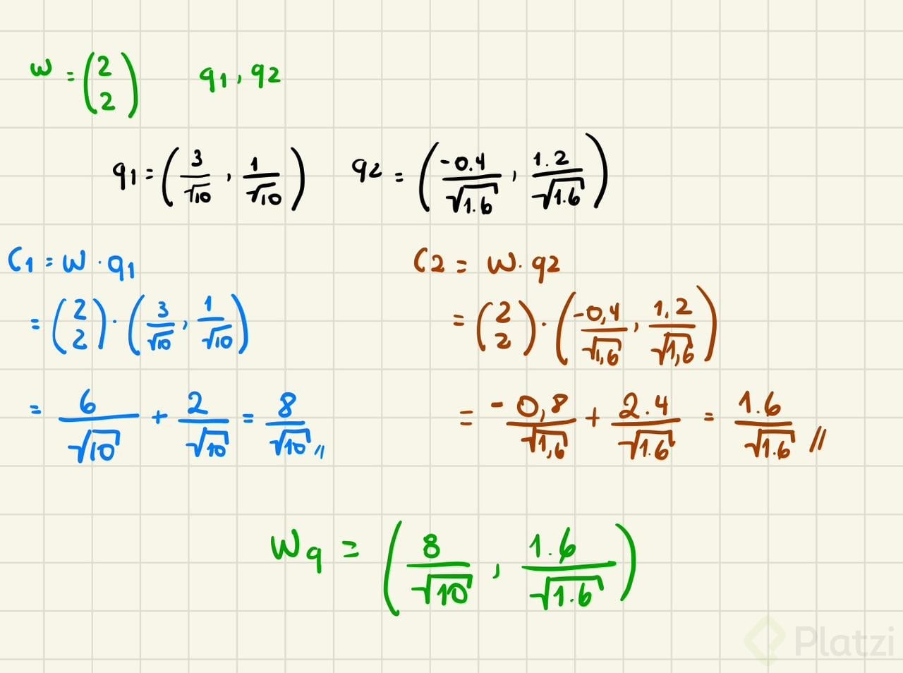 - En la base Q1, Q2: las coordenadas son (W·Q1, W·Q2). Mismo método, mismo atajo.