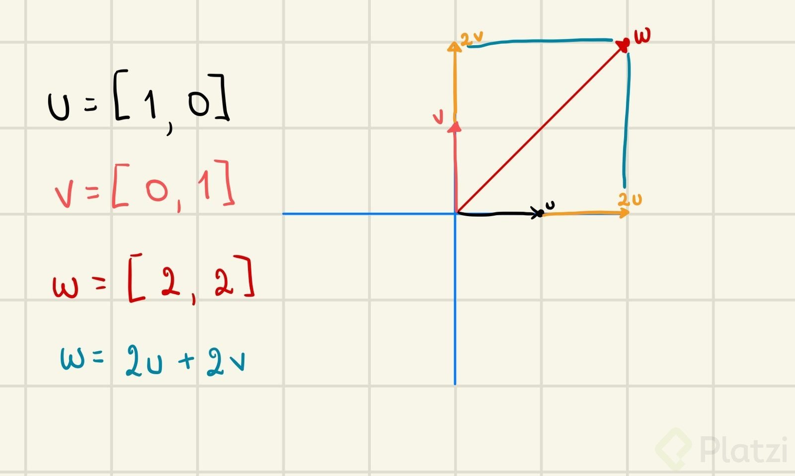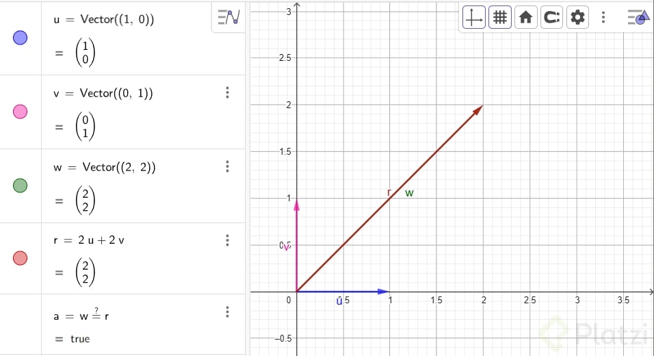 - Datos: u = (1,2), v = (3,1), w = 2u + v = (5,5).