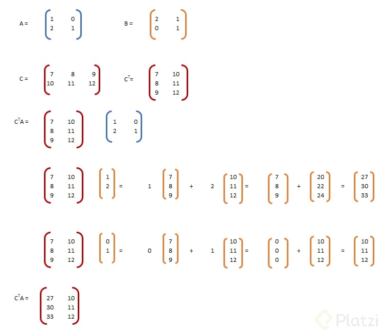- Solución: usar la transpuesta. C^T es 3 por 2 y ahora C^T por A sí es válido.