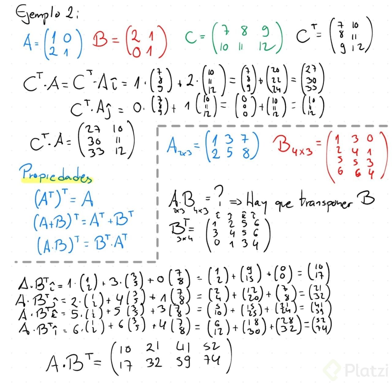- La transpuesta de un producto invierte el orden: (AB)^T = B^T A^T.