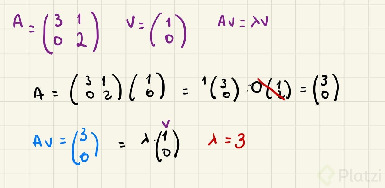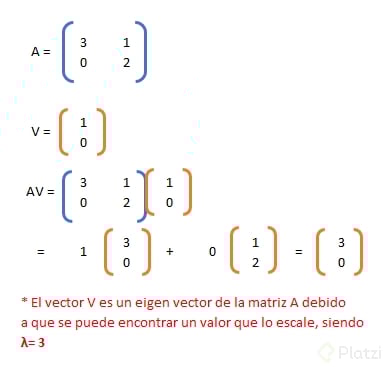 Un eigenvector (o autovector) de una matriz es un vector que, tras aplicar la transformación, no cambia de dirección: solo se estira o encoge. El eigenvalor (o autovalor) es el factor de escala asociado.