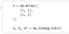 Descompón: U, S, VT = np.linalg.svd(A).