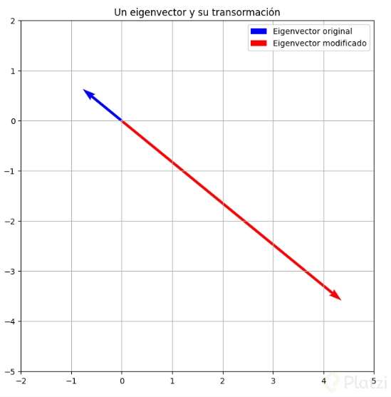 La gráfica refuerza la intuición: el vector original y su versión transformada quedan en la misma línea, solo escalados o invertidos.