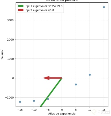 Te invito a comentar: si tus dos características fueran años de experiencia y salario (con fuerte covarianza positiva) y la varianza del salario fuera mucho mayor, ¿la elipse de datos sería más vertical u horizontal? ¿hacia dónde apuntaría el eigenvector principal? Comparte tu análisis y resultados.