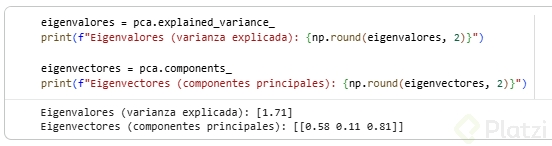 Eigenvectores y eigenvalores: los eigenvectores son direcciones de máxima varianza; los eigenvalores indican cuánta varianza captura cada dirección.