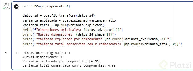 var_total = var_ratio.sum()print('Dimensiones originales:', X_3D.shape[1])print('Nuevas dimensiones:', X_2D.shape[1])print('Varianza explicada por componente:', np.round(var_ratio,2))print(f'Varianza total conservada con 2 componentes: {var_total:.2%}')