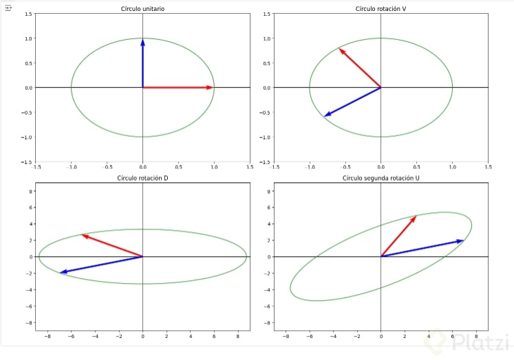 La descomposición de matrices es una herramienta poderosa que nos permite entender cómo una matriz original se transforma a través de distintas operaciones. En este caso, nos enfocaremos en la descomposición en valores singulares (SVD, por sus siglas en inglés) y cómo se refleja en transformaciones concretas. La representación de una matriz mediante SVD nos retorna tres matrices y podemos aplicar cada transformación paso a paso.